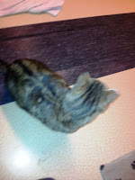 Strax efter hämtades vi andra katter och fick åka brummis till nya katthemmet. Det var lite läskigt i början. Jag ville inte ens äta godiset i början som jag fick av en av de snälla tjejerna, det ligger framför mig på bilden. Men senare när blogghjälpen tittade in var godiset borta. Vet inte vart det tog vägen.